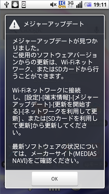 明るさを自動調整する機能もあります。ただ、トンネルの中ではトンネルの照明に合わせてチカチカするので地下鉄ユーザーはこの機能をオフにしておくと良いと思います。この機種は 2.3 へのアップデートが公開されていて、何日かに1度、アップデートの通知が表示されました。