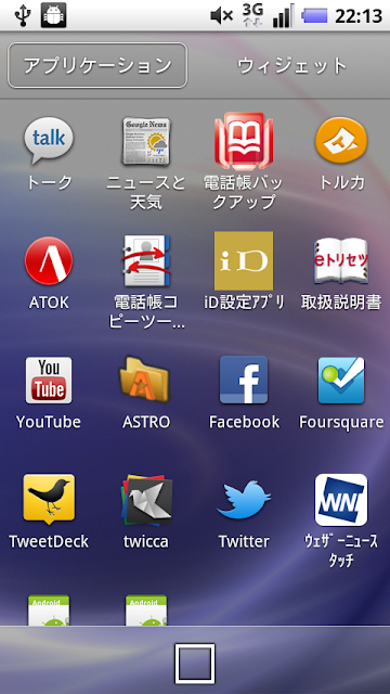 ASTRO、Facebook、Foursquare、TweetDeck、twicca、Twitter、ウェザーニュースタッチと表示されていないアプリ 2つは標準でインストールされているアプリではありません。